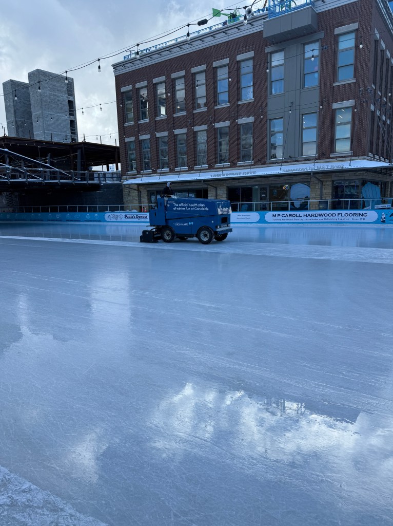 As I headed toward the ice rink’s entrance, I noticed a line and then realized the rink was empty. It was being conditioned by the Zamboni. It’s been a while since I’ve seen a Zamboni at work. I enjoyed watching the Zamboni move its way around the ice and seeing the “new” ice appear in its trail. Finally, the ice was smoothed out, and the rink was ready for skaters!